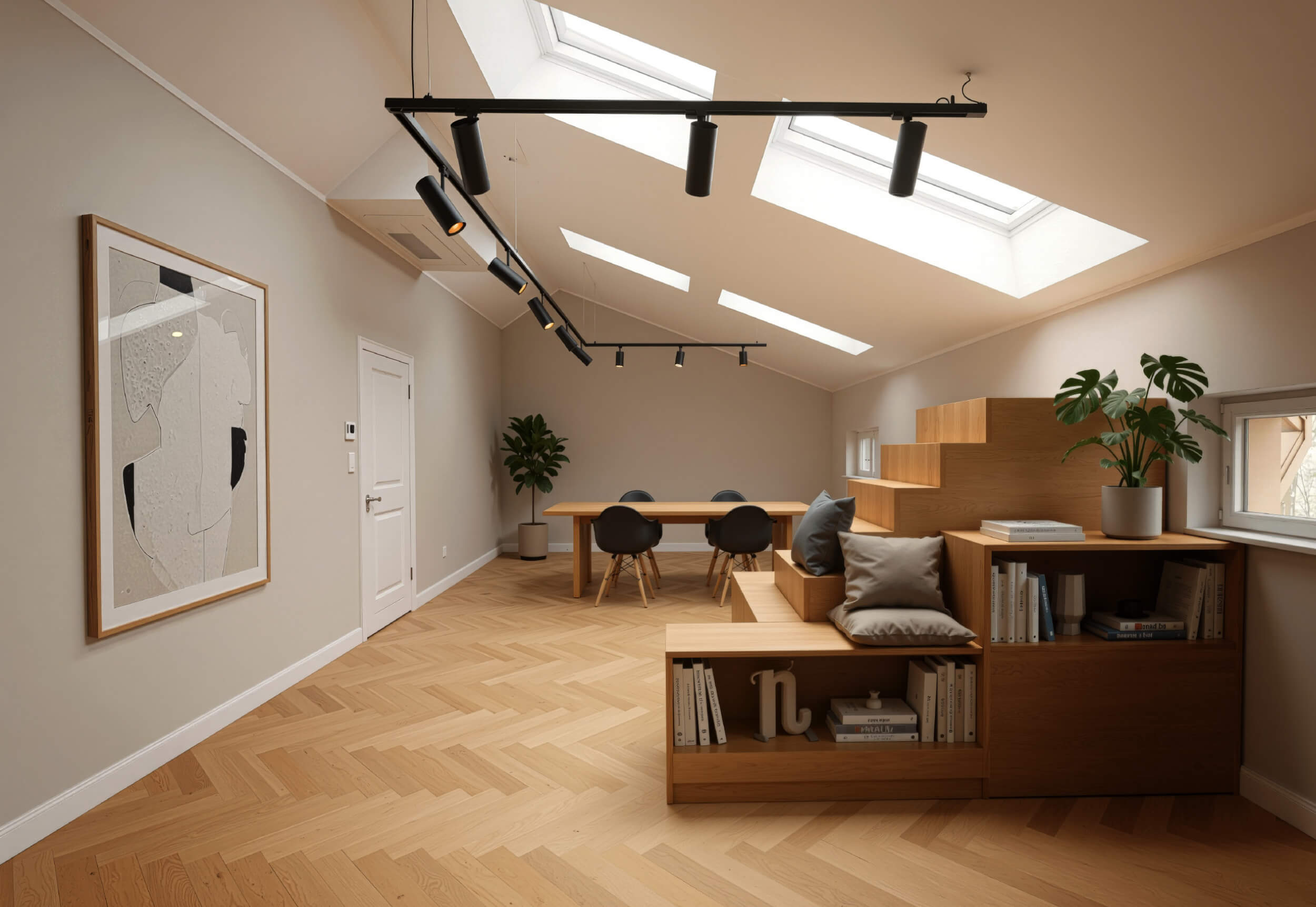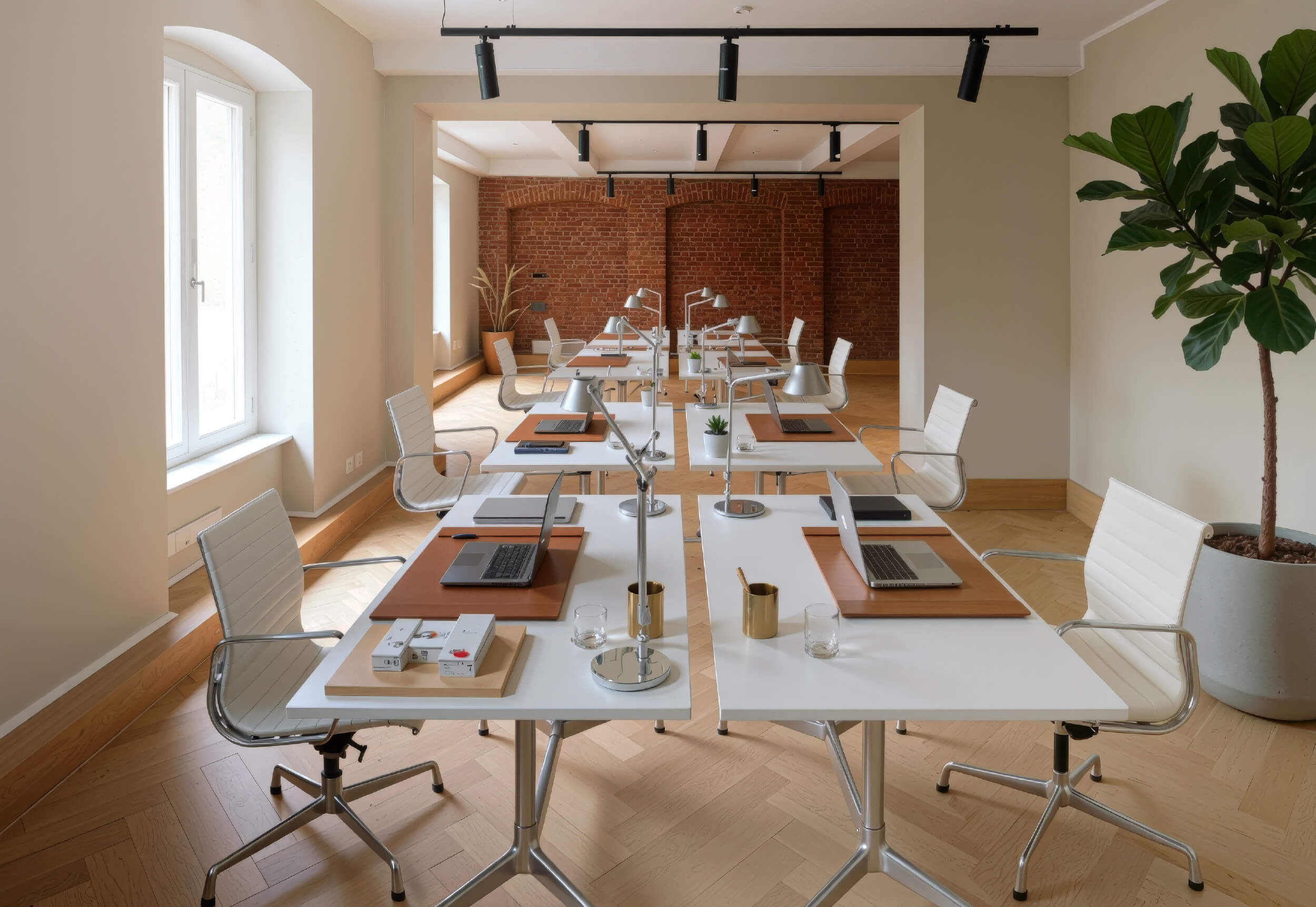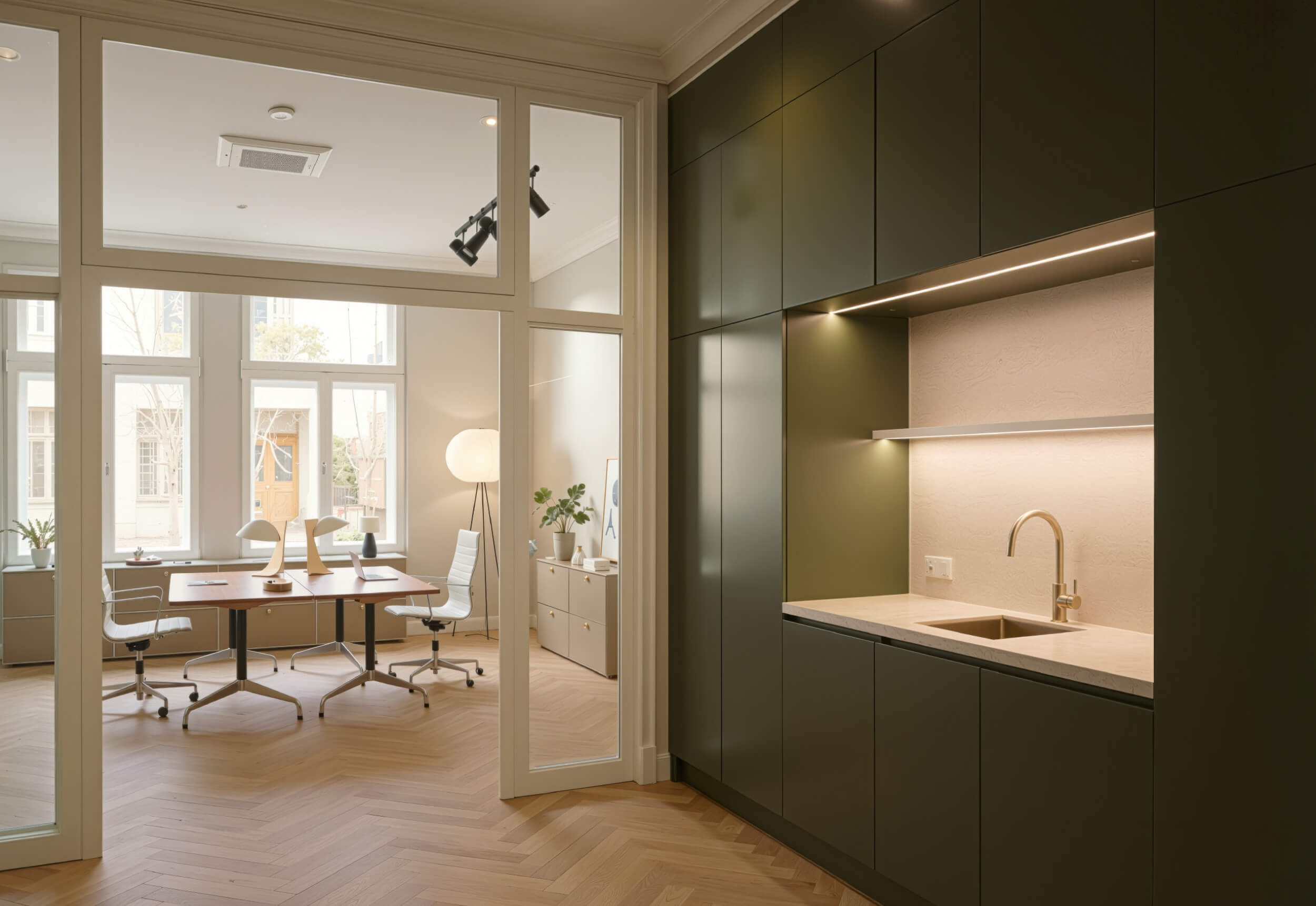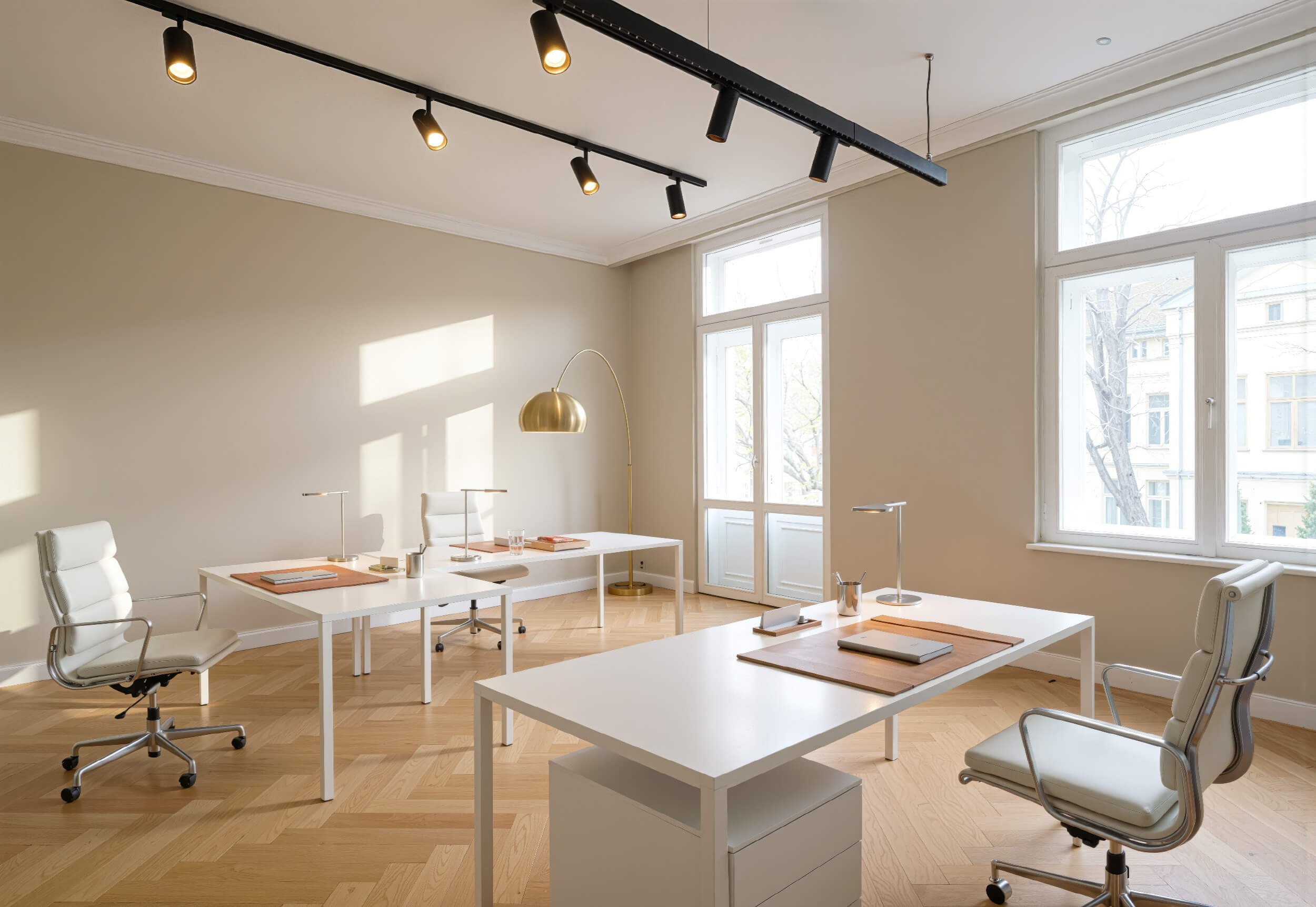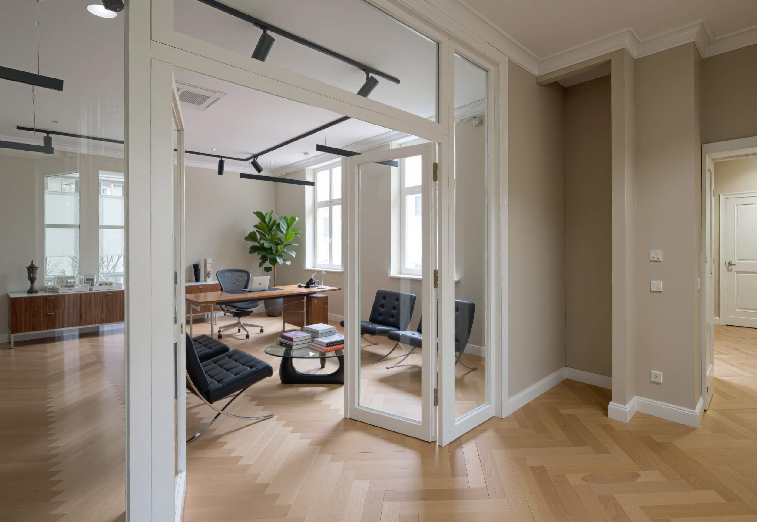 Die vier Etagen der Villa wurden mit höchster Präzision modernisiert: Fischgrätparkett, hochwertige Beschläge, Glastrennwände, maßgefertigte Einbauten, Coffee Corners und elegante Powder Rooms schaffen eine Atmosphäre wie in Boutique-Hotels oder Designstudios. Altbauhöhe, Licht und Materialien erzeugen eine ruhige, repräsentative Arbeitswelt. Auch die Kelleretage mit sichtbarem Ziegelmauerwerk wurde hochwertig ausgebaut und bietet flexible Flächen für Creative Units, Archive oder Meetingräume. Das Objekt eignet sich für unterschiedlichste Arbeitskulturen – von Kanzlei bis Kreativstudio.